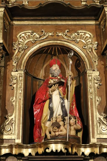 Colateral de la Epístola.- “San Miguel de los Santos” (atr. Antonio Bahamonde, 1779). Realizada con motivo de la beatificación de este fraile trinitario descalzo. Imagen de vestir, ataviado con el hábito de la Orden recamado en oro, porta en sus manos y pecho algunos de los principales atributos del Santo: Custodia, de tipo sol, referencia a su amor a Jesús Sacramentado; azucenas, símbolo de su castidad y pureza; corazón, en referencia al fenómeno de intercambio de corazones, culmen de su transformación espiritual, acaecido durante su estancia en Sevilla (1609-1611), mientras una noche Miguel de los Santos suplicaba al Señor que le cambiase su corazón por otro más encendido en su amor, se le apareció Jesucristo, le arrancó el corazón y le puso en el pecho el suyo propio. Contó con Hermandad o Congregación fundada en 1864 y con actividad hasta 1995. En honor a este santo se celebraban las fiestas del barrio. En otros tiempos, esta imagen salía en procesión al menos en dos ocasiones al año: en la Procesión de San Pedro Regalado (en 1929 y 1930) y en la Octava de la Parroquia, que se celebraba el 5 de julio, fiesta del santo. En el centro del remate, en una hornacina, se dispone una pequeña imagen de “Nuestra Señora de la Piedad”, del siglo XVIII.