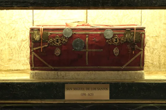 Capilla de San Miguel de los Santos.- Construida en 1779-1780. Con un retablo jónico que albergaba la imagen del entonces beato y en el remate la urna con sus restos mortales, sufragados – retablo y urna- por D. Pedro Flores Manzano, oidor de la Cancillería, en 1781. En esta capilla había otra destinada a ser Relicario. Con la supresión de capillas de la nave de la epístola efectuada en los años 70 del siglo XX, se perdió también este espacio tan singular, la urna con los restos mortales del Santo se colocaron bajo el ara en el presbiterio y la imagen en el colateral de la epístola.